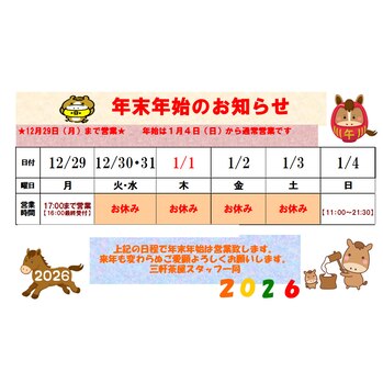 2026年のスタートは1月4日(日)11時~通常営業となります。